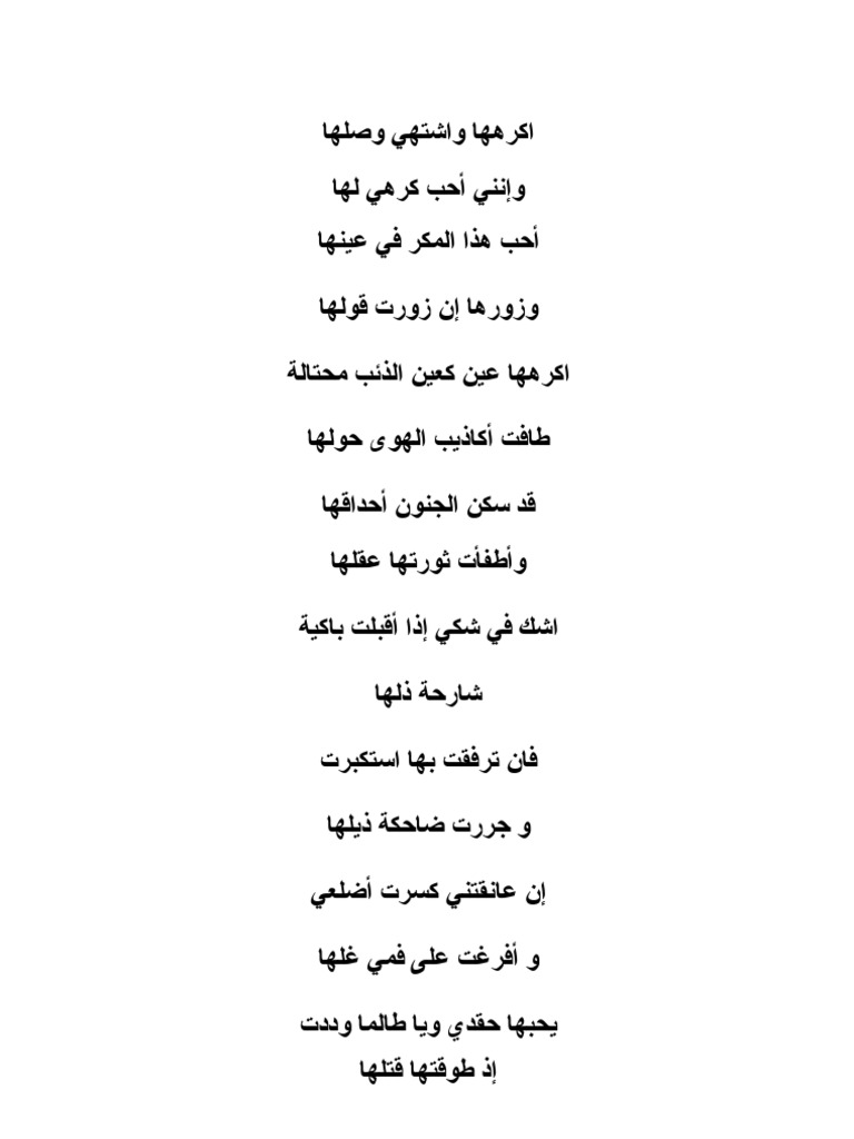 أكرهها وأشتهي وصلها وإنني أحب كرهي لها أحب هذا اللؤم في عينها وزورها إن زو رت قولها عين كعين الذئب محتالة طافت أكاذيب الهوى حولها قد سكن الجنون أحداقها وأطفأت ثورت ها عقل ها أش ك