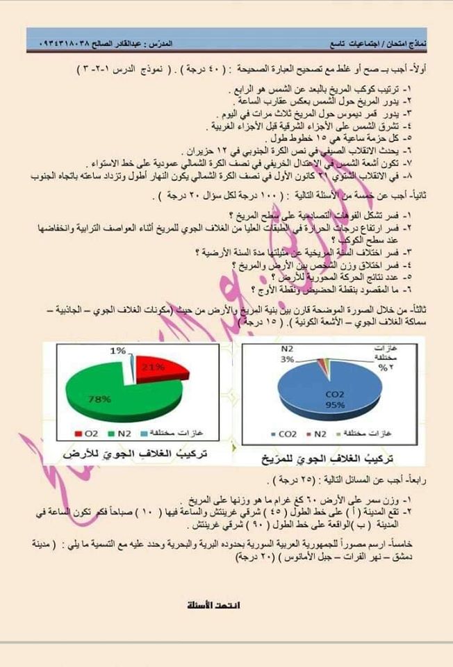 اسئلة امتحان مادة الاجتماعيات للصف التاسع سوريا ورقة الإمتحان