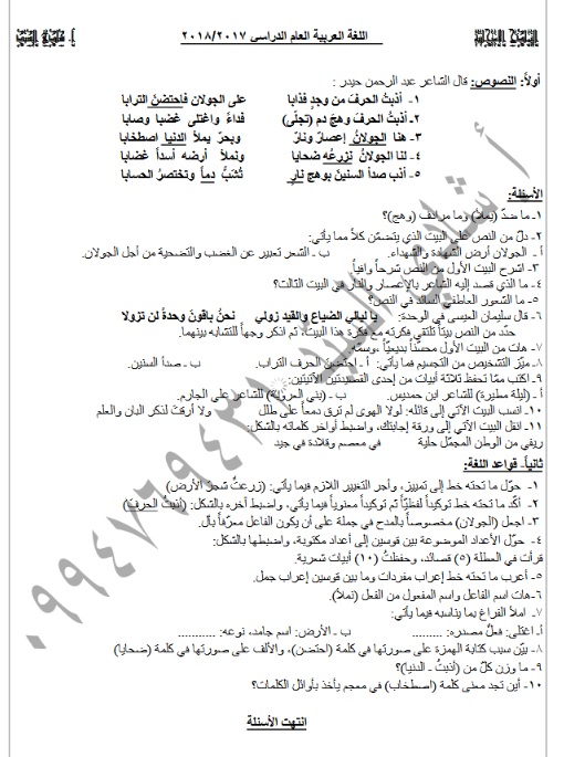 نماذج امتحانات في اللغة العربية للصف التاسع في سوريا