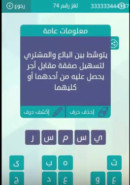 حل يتوسط بين البائع والمشتري لتسهيل صفقة مقابل اجر يحصل عليه من احدهما او كليهما لغز رقم 74 من لعبة صقور الإبدآع