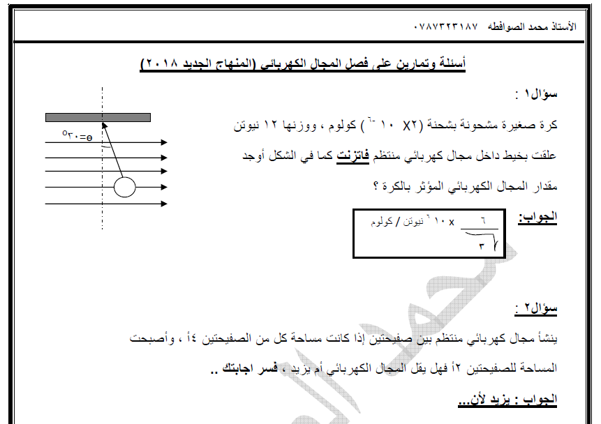تمارين وأسئلة على فصل المجال الكهربائي المنهاج الجديد 2017 2018 فيزياء علمي وصناعي Physics