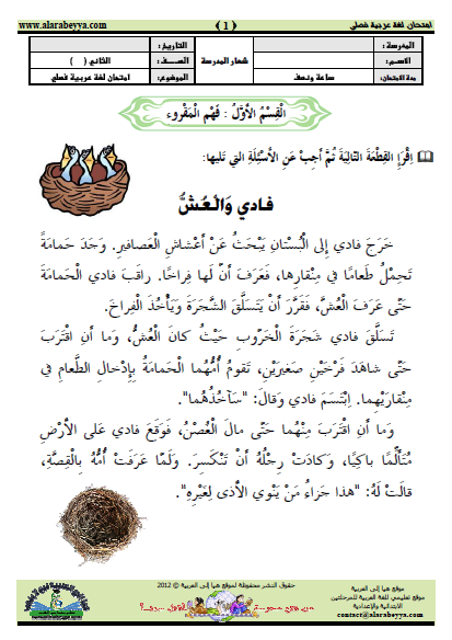 امتحان فهم المقروء فادي والعش في اللغة العربية للصف الثاني الفصل الدراسي الثالث 2018