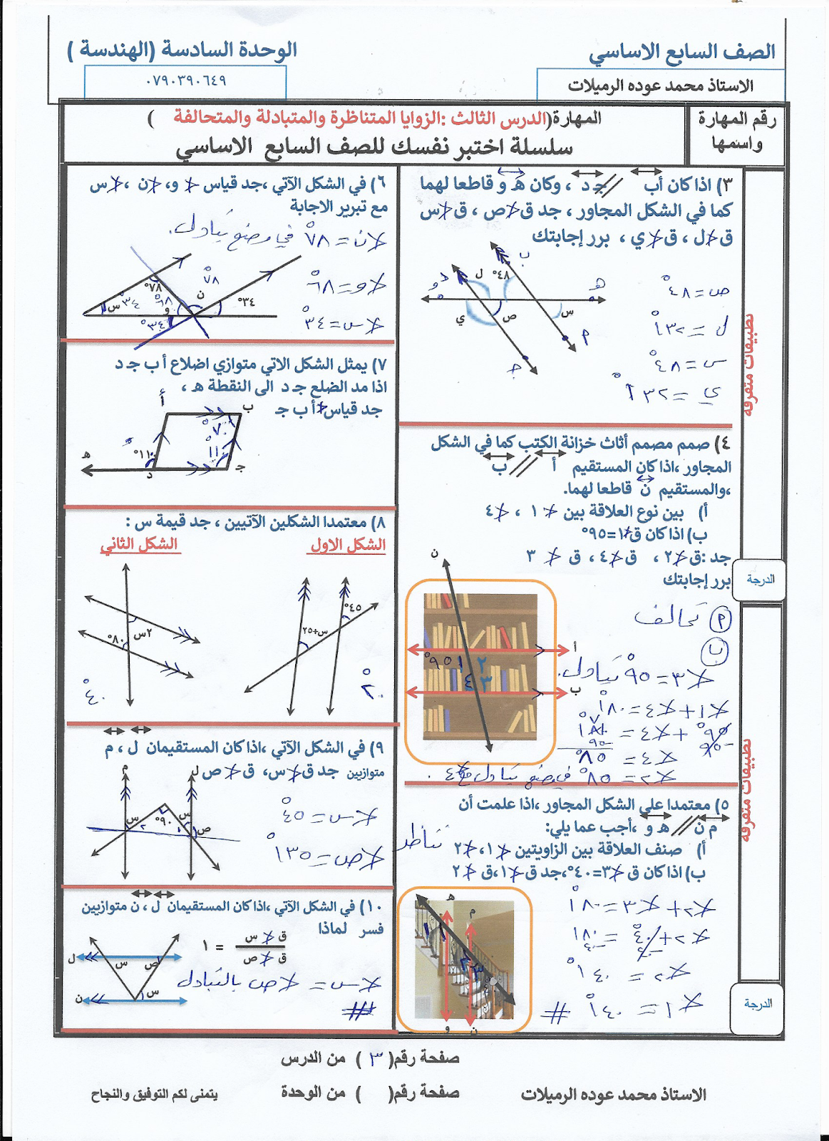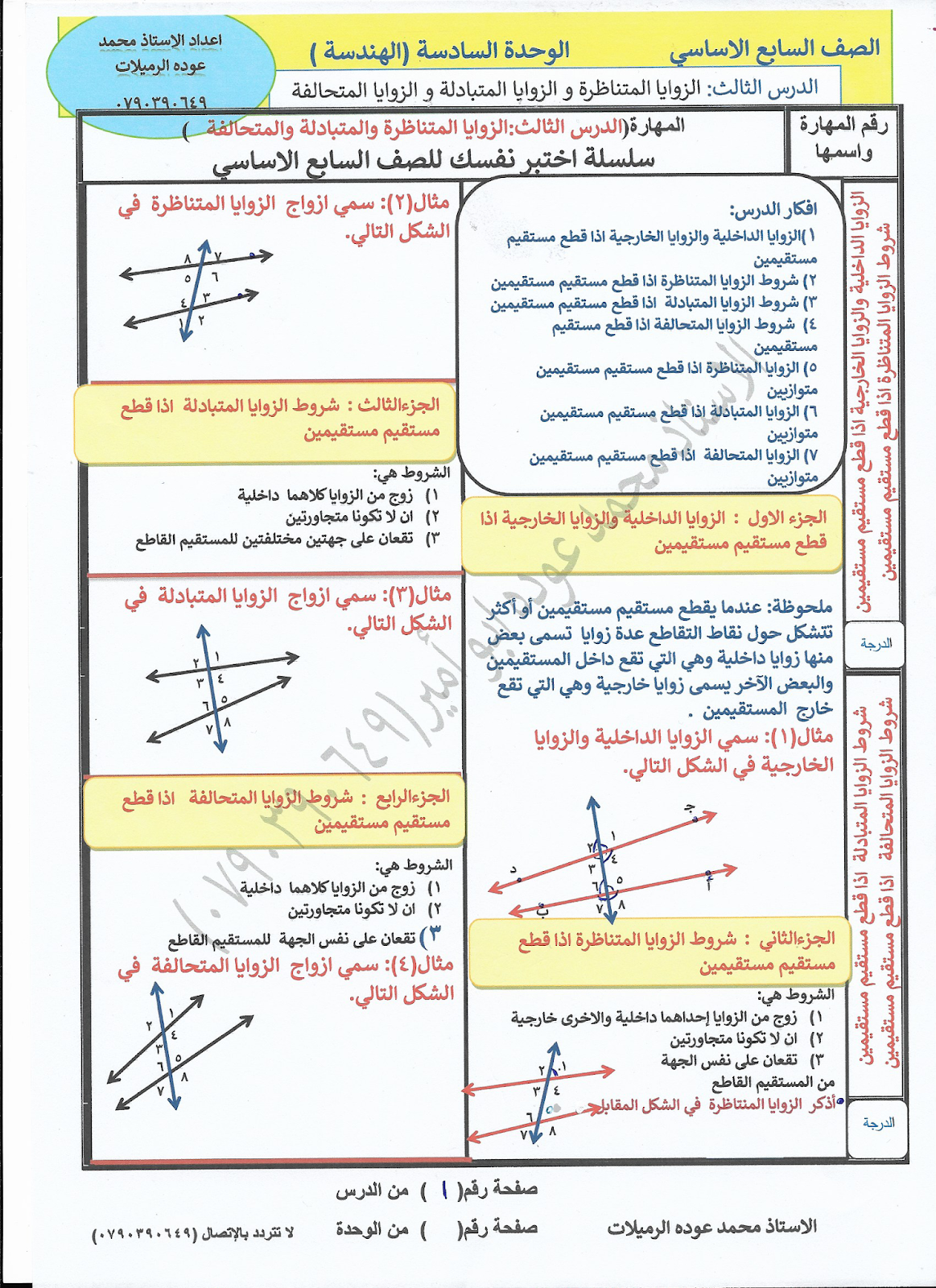 الدرس الثالث الزوايا المتناظرة والمتبادلة والمتحالفة سلسلة اختبر نفسك للصف السابع الاساسي