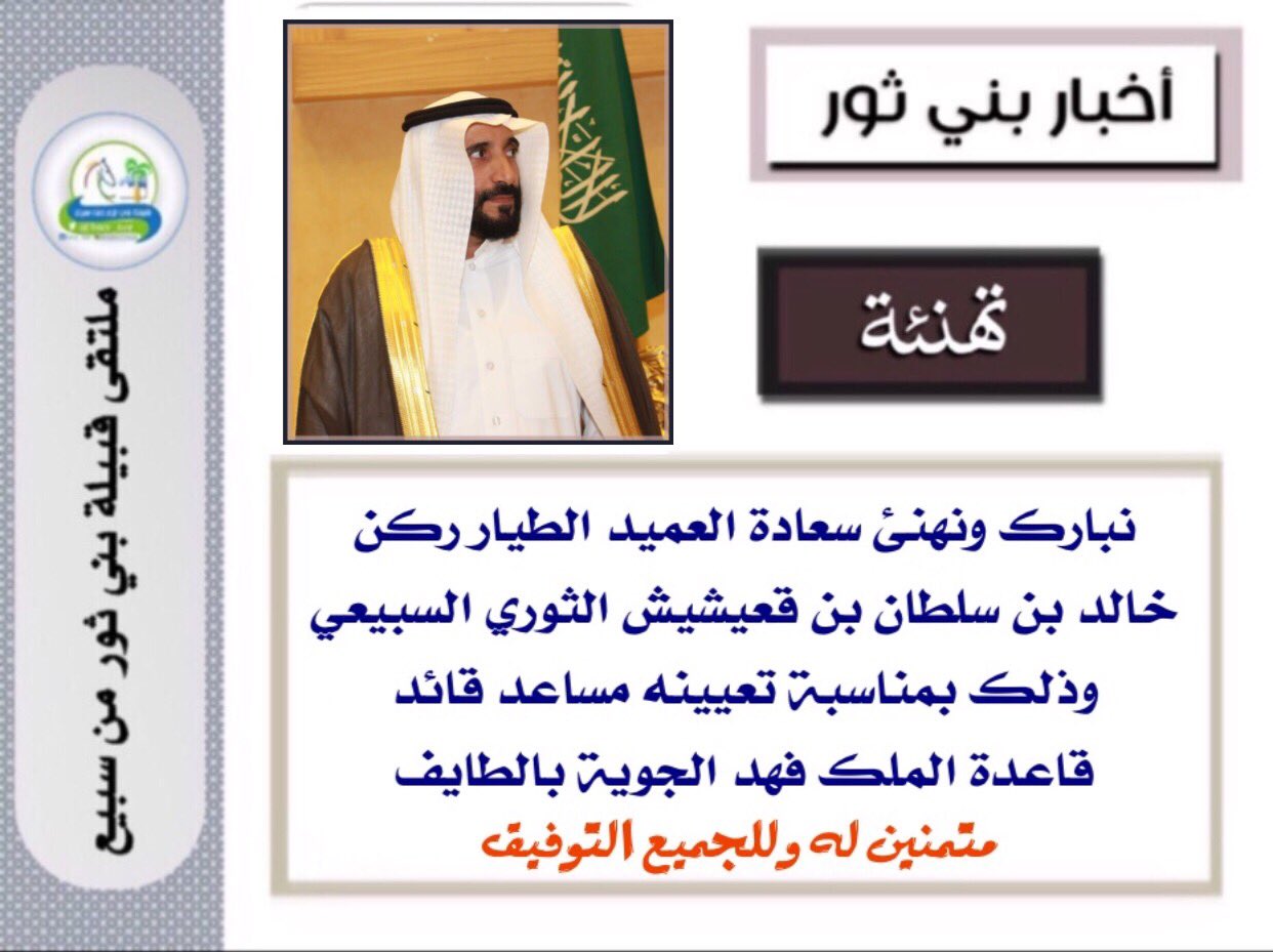 ملتقى قبيلة بني ثور من سبيع الغلبا On Twitter نبارك ونهنئ سعادة العميد الطيار ركن خالد بن سلطان بن قعيشيش الثوري السبيعي وذلك بمناسبة تعيينه مساعد قائد قاعدة الملك فهد الجوية بالطايف