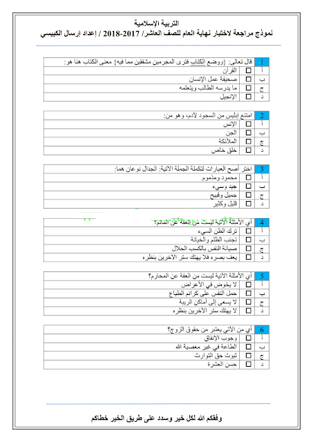 نموذج مراجعة لاختبار نهاية العام في التربية الاسلامية للصف العاشر الفصل الثالث 2018