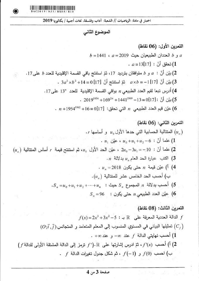 موضوع الرياضيات بكالوريا 2019 شعبة آداب وفلسفة