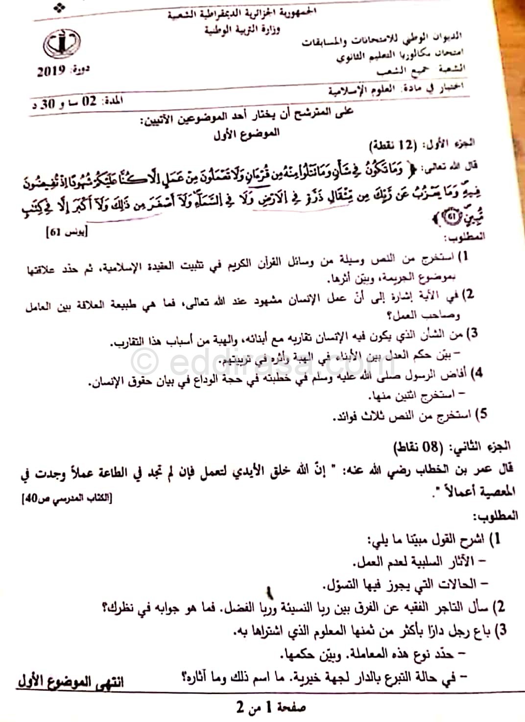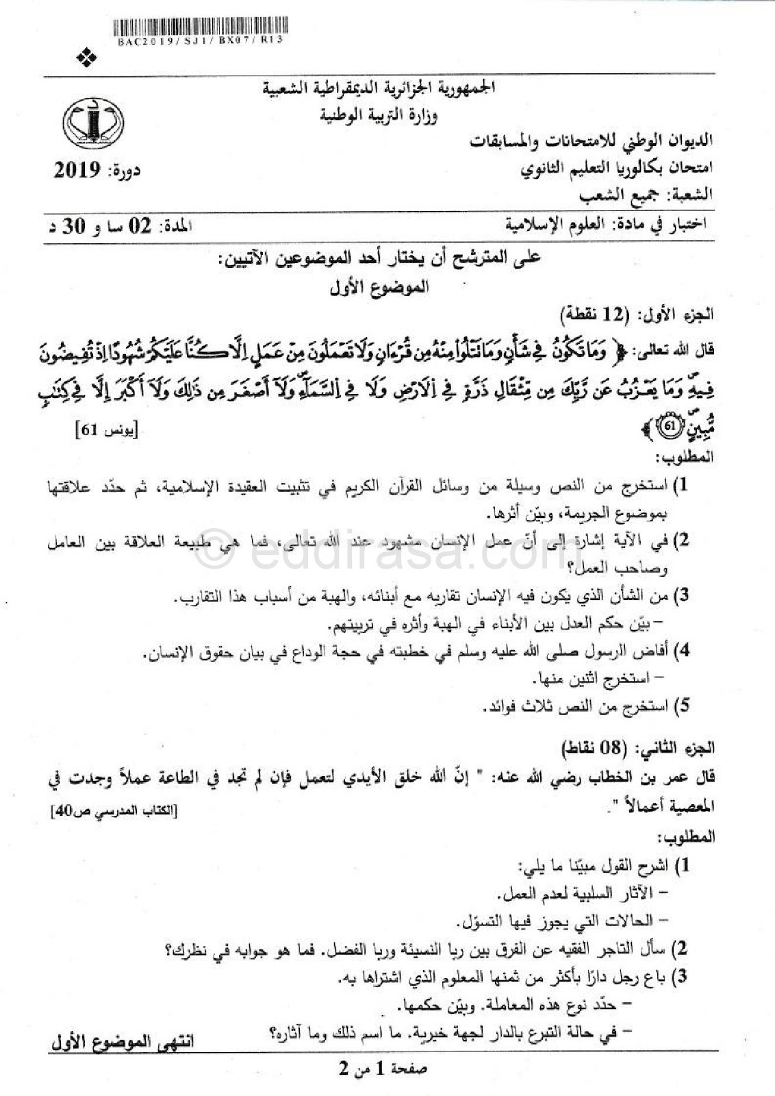 موضوع العلوم الاسلامية بكالوريا 2019 شعبة رياضيات