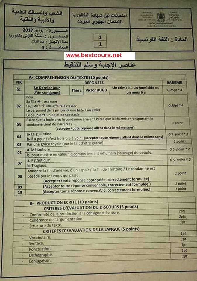 امتحانات مادة الفرنسية التصحيح أولى باك اداب و علوم أصحاب الجهوي