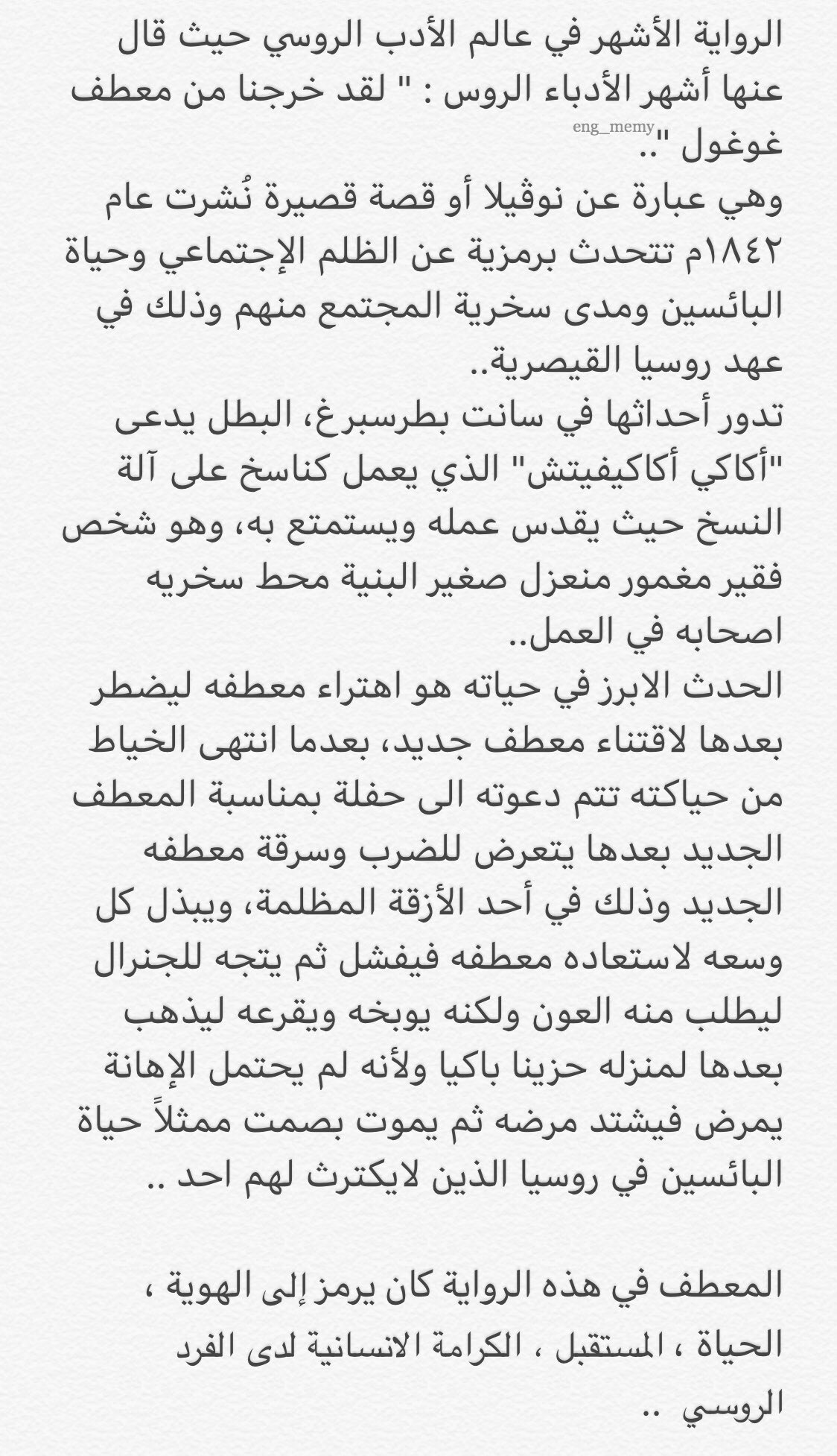 ريم On Twitter ٤٢ رواية المعطف للكاتب الروسي نيكولاي غوغول الاقتباسات لكن المرء يلاحظ في عالمنا أن بعض الناس الذين يعتبرون بعض الأمور غير مهمة على الإطلاق يعتبرها آخرون