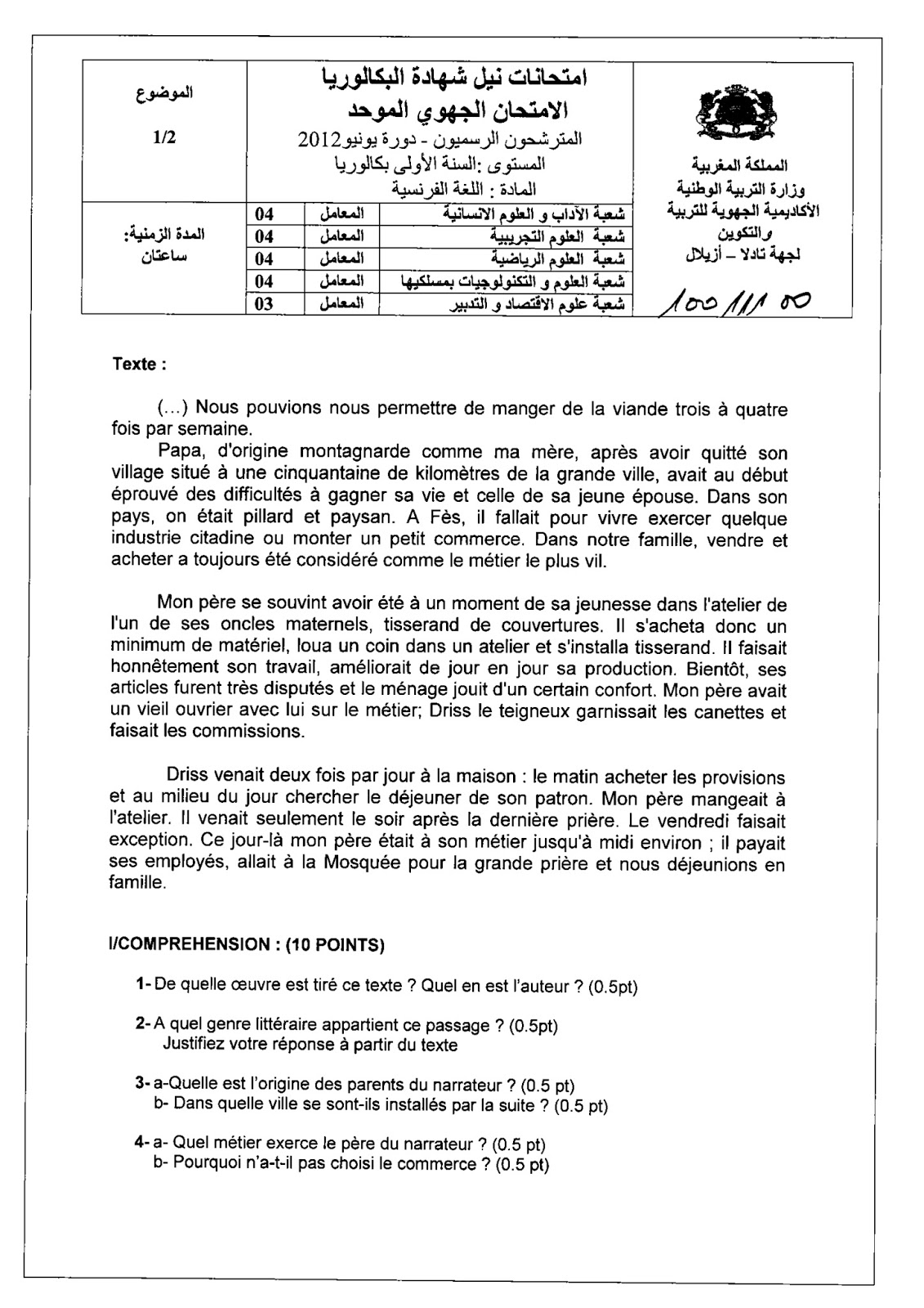 الامتحان الجهوي الأولى بكالوريا 2012 في اللغة الفرنسية الآداب والعلوم الإنسانية الدورة العادية جهة تادلة أزيلال