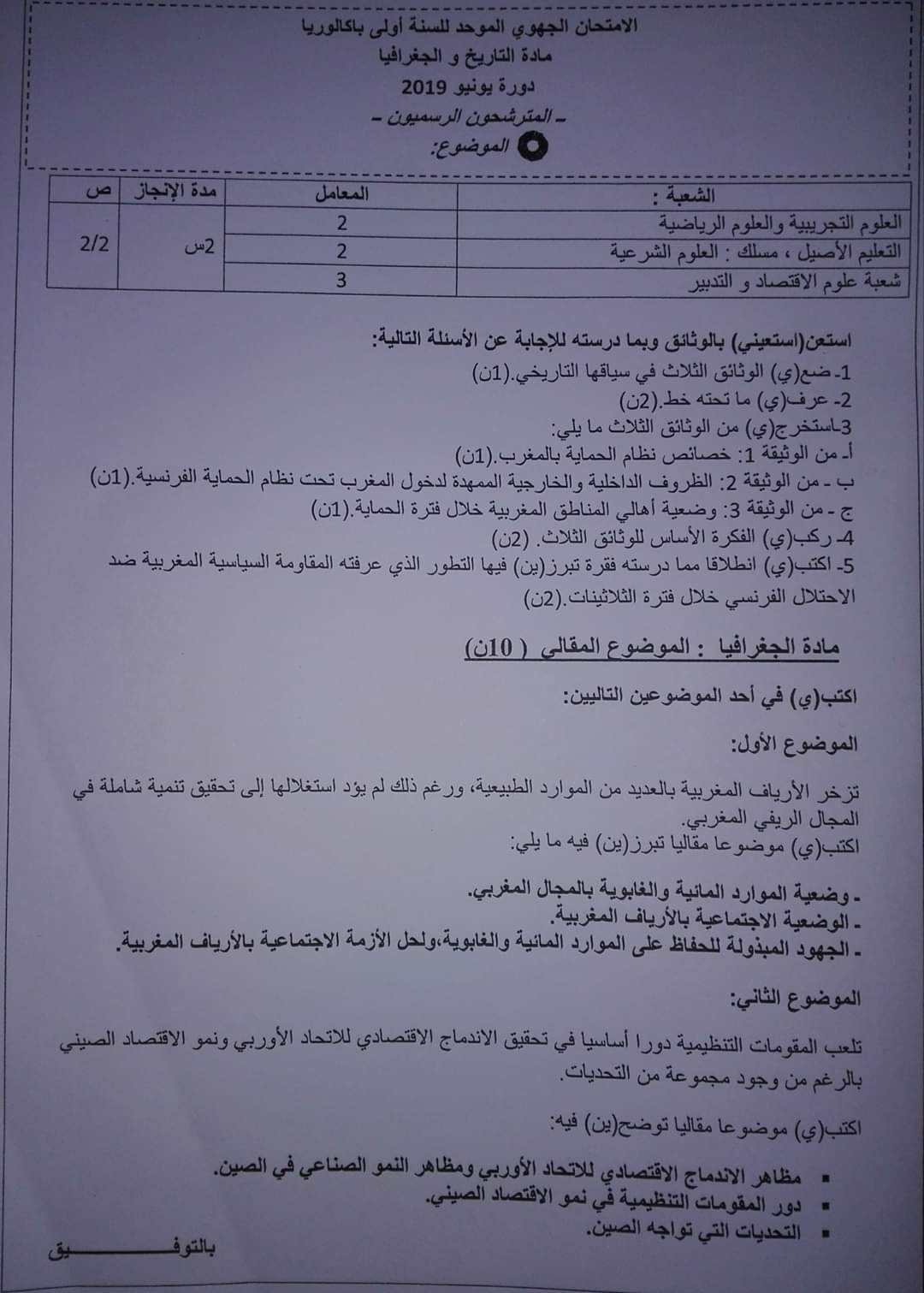الامتحان الجهوي اولى باك 2019 في التاريخ والجغرافيا Moutamadris Ma