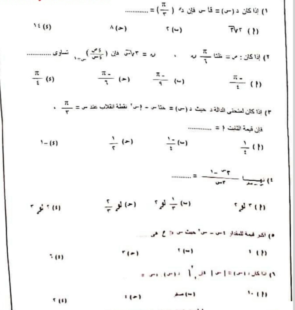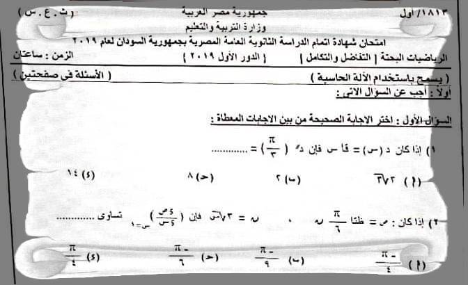 امتحان التفاضل والتكامل للثانوية العامة الدور الأول 2019