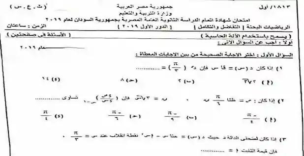 امتحان السودان فى التفاضل والتكامل ثانوية عامة 2019